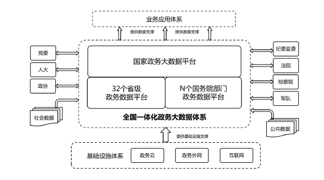 全國一體化政務(wù)大數(shù)據(jù)體系包括三類平臺(tái)和三大支撐。三類平臺(tái)為“1+32+N”框架結(jié)構(gòu)。“1”是指國家政務(wù)大數(shù)據(jù)平臺(tái),是我國政務(wù)數(shù)據(jù)管理的總樞紐、政務(wù)數(shù)據(jù)流轉(zhuǎn)的總通道、政務(wù)數(shù)據(jù)服務(wù)的總門戶;“32”是指31個(gè)?。ㄗ灾螀^(qū)、直轄市)和新疆生產(chǎn)建設(shè)兵團(tuán)統(tǒng)籌建設(shè)的省級(jí)政務(wù)數(shù)據(jù)平臺(tái),負(fù)責(zé)本地區(qū)政務(wù)數(shù)據(jù)的目錄編制、供需對接、匯聚整合、共享開放,與國家平臺(tái)實(shí)現(xiàn)級(jí)聯(lián)對接;“N”是指國務(wù)院有關(guān)部門的政務(wù)數(shù)據(jù)平臺(tái),負(fù)責(zé)本部門本行業(yè)數(shù)據(jù)匯聚整合與供需對接,與國家平臺(tái)實(shí)現(xiàn)互聯(lián)互通,尚未建設(shè)政務(wù)數(shù)據(jù)平臺(tái)的部門,可由國家平臺(tái)提供服務(wù)支撐。三大支撐包括管理機(jī)制、標(biāo)準(zhǔn)規(guī)范、安全保障三個(gè)方面。