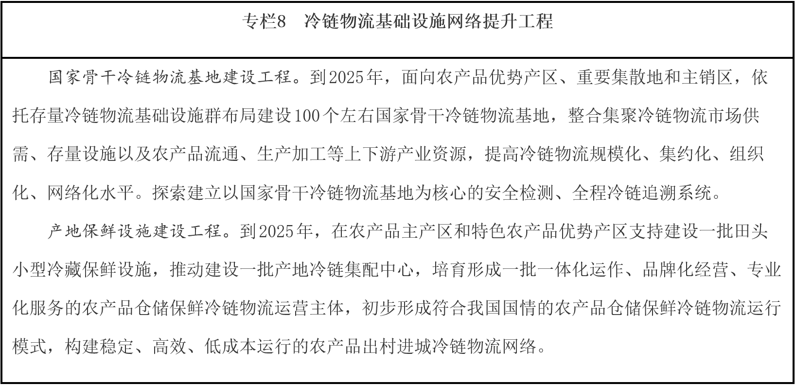 提高冷鏈物流質量效率。大力發(fā)展鐵路冷鏈運輸和集裝箱公鐵水聯(lián)運,對接主要農產品產區(qū)和集散地,創(chuàng)新冷鏈物流干支銜接模式。發(fā)展“生鮮電商+產地直發(fā)”等冷鏈物流新業(yè)態(tài)新模式。推廣蓄冷箱、保溫箱等單元化冷鏈載器具和標準化冷藏車,促進冷鏈物流信息互聯(lián)互通,提高冷鏈物流規(guī)?;?、標準化水平。依托國家骨干冷鏈物流基地、產銷冷鏈集配中心等大型冷鏈物流設施,加強生鮮農產品檢驗檢疫、農獸藥殘留及防腐劑、保鮮劑、添加劑合規(guī)使用等質量監(jiān)管。研究推廣應用冷鏈道路運輸電子運單,加強產品溯源和全程溫濕度監(jiān)控,將源頭至終端的冷鏈物流全鏈條納入監(jiān)管范圍,提升冷鏈物流質量保障水平。健全進口冷鏈食品檢驗檢疫制度,筑牢疫情外防輸入防線。