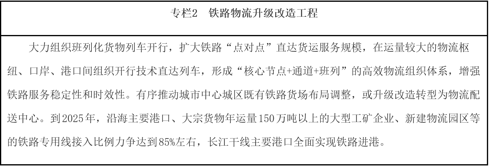 推進結構性降成本。加快推進鐵路專用線進港區(qū)、連園區(qū)、接廠區(qū),合理有序推進大宗商品等中長距離運輸“公轉鐵”、“公轉水”。完善集裝箱公鐵聯(lián)運銜接設施,鼓勵發(fā)展集拼集運、模塊化運輸、“散改集”等組織模式,發(fā)揮鐵路干線運輸成本低和公路網絡靈活優(yōu)勢,培育有競爭力的“門到門”公鐵聯(lián)運服務模式,降低公鐵聯(lián)運全程物流成本。統(tǒng)籌沿海港口綜合利用,提升大型港口基礎設施服務能力,提高碼頭現(xiàn)代化專業(yè)化規(guī)模化水平,加快推進鐵水聯(lián)運銜接場站改造,提高港口鐵路專用線集疏網絡效能,優(yōu)化作業(yè)流程。完善內河水運網絡,統(tǒng)籌江海直達、江海聯(lián)運發(fā)展,發(fā)揮近海航線、長江水道、珠江水道等水運效能,穩(wěn)步推進貨物運輸“公轉水”。推進鐵水聯(lián)運業(yè)務單證電子化,促進鐵路、港口信息互聯(lián),實現(xiàn)鐵路現(xiàn)車、裝卸車、貨物在途、到達預確報以及港口裝卸、貨物堆存、船舶進出港、船期艙位預定等鐵水聯(lián)運信息交換共享。支持港口、鐵路場站加快完善集疏運油氣管網,有效對接石化等產業(yè)布局,提高管道運輸比例。