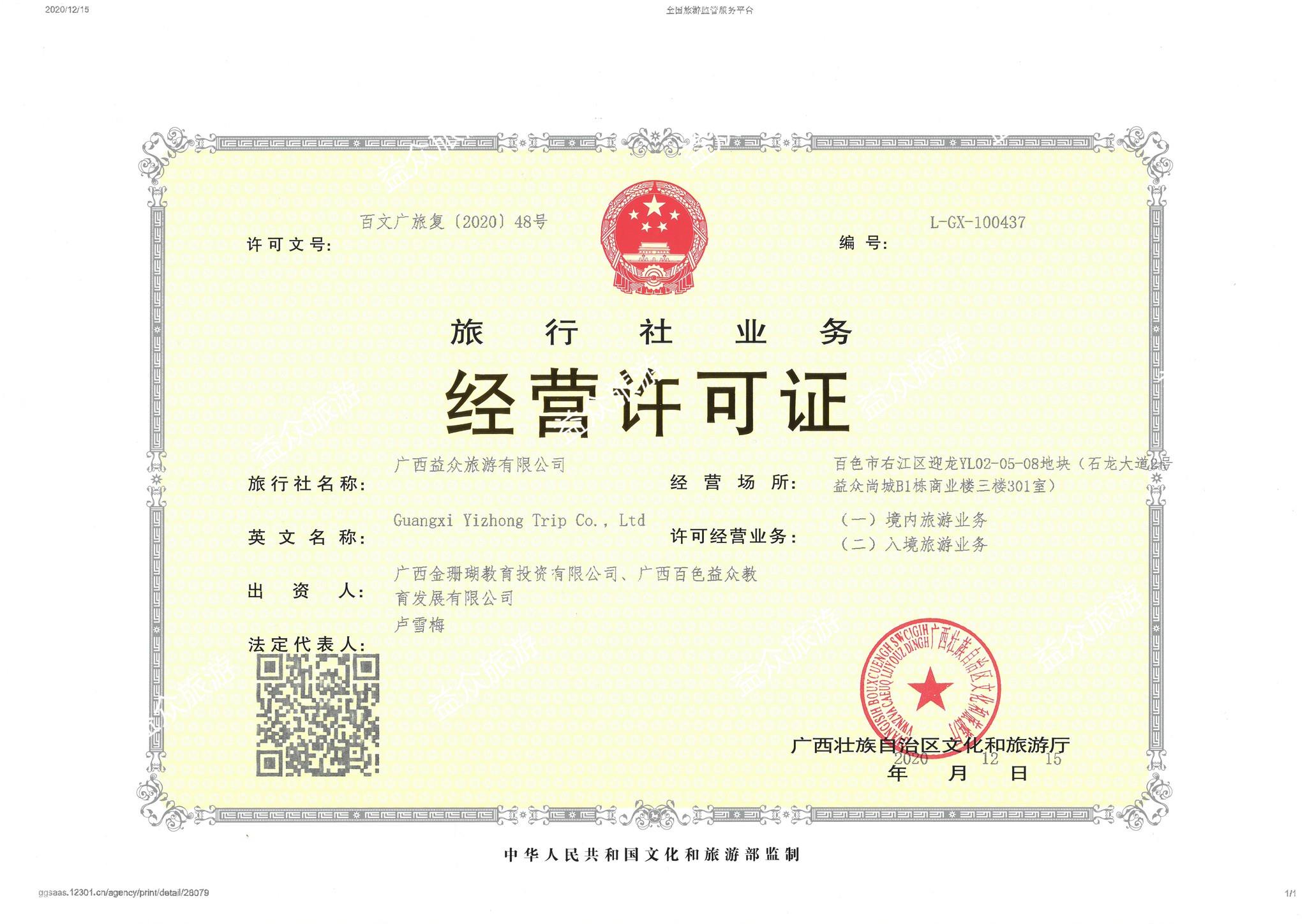 ????????12月15日,廣西益眾旅游有限公司通過廣西壯族自治區(qū)文化和旅游廳各項(xiàng)認(rèn)證,符合國家各項(xiàng)標(biāo)準(zhǔn)要求,獲得了旅行社業(yè)務(wù)經(jīng)營許可證。