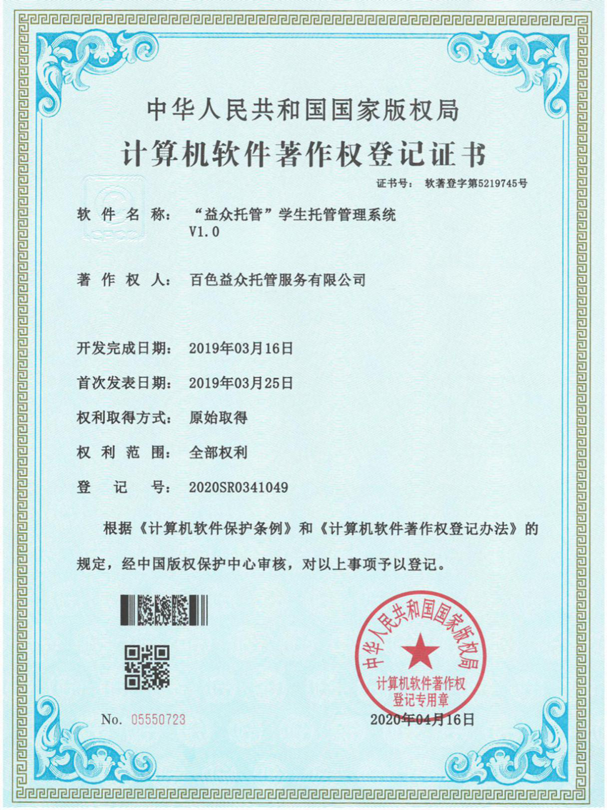 日前,經(jīng)中國版權(quán)保護中心審核,百色益眾托管服務(wù)有限公司提交的《“益眾托管”學(xué)生托管管理系統(tǒng)》符合《計算機軟件保護條例》和《計算機軟件著作權(quán)登記辦法》的相關(guān)規(guī)定,被認定為原始取得,獲得國家版權(quán)局頒發(fā)《計算機軟件著作權(quán)登記證書》。