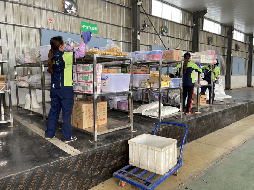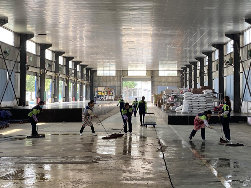 在倉庫,員工們對貨物架、倉庫地板進行清潔、擦拭,保證貨物在合適的環(huán)境下儲存。