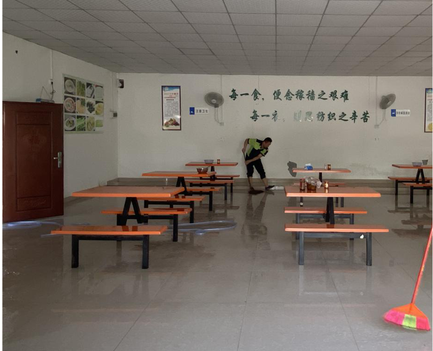 在食堂,員工們清潔地板,擦拭廚房和用餐區(qū)域的廚房用品和餐具,保證用餐環(huán)境的干凈整潔。