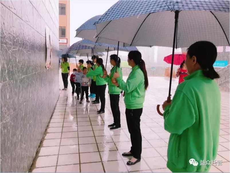 ??? 突如其來(lái)的大雨讓孩子們寸步難行,公司各校區(qū)第一時(shí)間啟動(dòng)雨天動(dòng)線方案。托管老師們撐起雨傘,從教室門口到食堂為孩子們構(gòu)筑了一條無(wú)雨通道,護(hù)送孩子們到食堂用餐,保障下雨期間的學(xué)生人身安全。