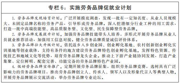 穩(wěn)定和擴(kuò)大農(nóng)村勞動(dòng)力外出就業(yè)規(guī)模。廣泛開(kāi)展區(qū)域間勞務(wù)協(xié)作,健全勞務(wù)輸入集中區(qū)域與勞務(wù)輸出省份對(duì)接協(xié)調(diào)機(jī)制,加強(qiáng)勞動(dòng)力跨區(qū)域精準(zhǔn)對(duì)接,發(fā)展勞務(wù)組織和經(jīng)紀(jì)人,有序組織輸出地農(nóng)村勞動(dòng)力外出務(wù)工。培育一批有地域特色、行業(yè)特征、技能特點(diǎn),帶動(dòng)農(nóng)村勞動(dòng)力就業(yè)效果好的勞務(wù)品牌。實(shí)施農(nóng)民工素質(zhì)提升工程,推進(jìn)新生代農(nóng)民工職業(yè)技能提升計(jì)劃。創(chuàng)建一批農(nóng)村勞動(dòng)力轉(zhuǎn)移就業(yè)示范縣。