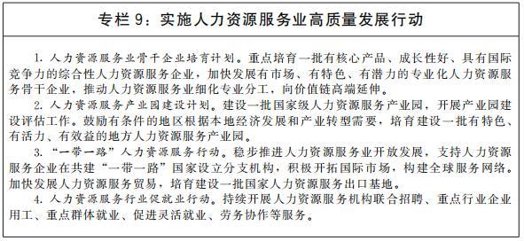 加快人力資源服務(wù)業(yè)高質(zhì)量發(fā)展。推動(dòng)人力資源服務(wù)與實(shí)體經(jīng)濟(jì)融合發(fā)展,引導(dǎo)人力資源服務(wù)機(jī)構(gòu)圍繞產(chǎn)業(yè)基礎(chǔ)高級(jí)化、產(chǎn)業(yè)鏈現(xiàn)代化提供精準(zhǔn)專業(yè)服務(wù)。鼓勵(lì)人力資源服務(wù)業(yè)管理創(chuàng)新、技術(shù)創(chuàng)新、服務(wù)創(chuàng)新和產(chǎn)品創(chuàng)新,大力發(fā)展人力資源管理咨詢、高級(jí)人才尋訪、人才測(cè)評(píng)等高技術(shù)、高附加值業(yè)態(tài)。實(shí)施人力資源服務(wù)業(yè)領(lǐng)軍人才培養(yǎng)計(jì)劃。開(kāi)展“互聯(lián)網(wǎng)+人力資源服務(wù)”行動(dòng)。深化人力資源服務(wù)領(lǐng)域?qū)ν忾_(kāi)放,探索建設(shè)國(guó)家人力資源服務(wù)出口基地。