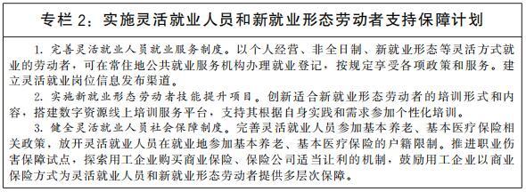 支持多渠道靈活就業(yè)和新就業(yè)形態(tài)發(fā)展。破除各種不合理限制,建立促進(jìn)多渠道靈活就業(yè)機(jī)制,支持和規(guī)范發(fā)展新就業(yè)形態(tài)。鼓勵(lì)傳統(tǒng)行業(yè)跨界融合、業(yè)態(tài)創(chuàng)新,增加靈活就業(yè)和新就業(yè)形態(tài)就業(yè)機(jī)會(huì)。加快落實(shí)《關(guān)于維護(hù)新就業(yè)形態(tài)勞動(dòng)者勞動(dòng)保障權(quán)益的指導(dǎo)意見(jiàn)》,建立完善適應(yīng)靈活就業(yè)和新就業(yè)形態(tài)的勞動(dòng)權(quán)益保障制度,引導(dǎo)支持靈活就業(yè)人員和新就業(yè)形態(tài)勞動(dòng)者參加社會(huì)保險(xiǎn),提高靈活就業(yè)人員和新就業(yè)形態(tài)勞動(dòng)者社會(huì)保障水平。規(guī)范平臺(tái)企業(yè)用工,明確平臺(tái)企業(yè)勞動(dòng)保護(hù)責(zé)任。健全職業(yè)分類(lèi)動(dòng)態(tài)調(diào)整機(jī)制,持續(xù)開(kāi)發(fā)新職業(yè),發(fā)布新職業(yè)標(biāo)準(zhǔn)。