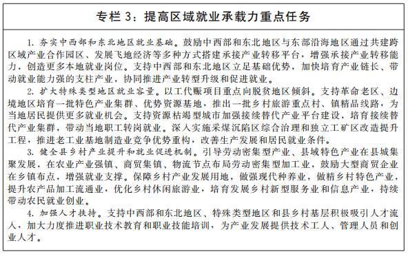 推動(dòng)區(qū)域就業(yè)協(xié)調(diào)發(fā)展。支持東部地區(qū)發(fā)揮創(chuàng)新要素集聚優(yōu)勢(shì),率先實(shí)現(xiàn)產(chǎn)業(yè)升級(jí),開(kāi)拓高質(zhì)量就業(yè)新領(lǐng)域,培育高質(zhì)量就業(yè)增長(zhǎng)極。加快完善中西部和東北地區(qū)基礎(chǔ)設(shè)施,提升產(chǎn)業(yè)集聚區(qū)公共服務(wù)效能,引導(dǎo)產(chǎn)業(yè)向中西部和東北地區(qū)有序梯度轉(zhuǎn)移,推動(dòng)就業(yè)機(jī)會(huì)向中西部和東北地區(qū)擴(kuò)散。支持中西部和東北地區(qū)根據(jù)國(guó)家戰(zhàn)略導(dǎo)向和發(fā)展重點(diǎn),對(duì)接先進(jìn)生產(chǎn)要素和創(chuàng)新資源,發(fā)展特色優(yōu)勢(shì)產(chǎn)業(yè),改造提升傳統(tǒng)產(chǎn)業(yè),積極布局新興產(chǎn)業(yè),厚植就業(yè)創(chuàng)業(yè)沃土。