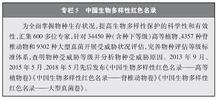 開展全國生物多樣性調查與評估。大力推進生物多樣性保護重大工程實施,結合自然資源調查、生態(tài)系統(tǒng)監(jiān)測評估等工作,不斷完善生物多樣性調查與評估能力,首次將生物多樣性指標納入生態(tài)質量綜合評價指標體系,引導地方加強生態(tài)文明建設與生物多樣性保護。開展自然資源調查,包括森林、草原、水、濕地、荒漠、海洋等,建立自然資源調查評價監(jiān)測制度。構建了涵蓋2376個縣級行政單元、樣線總長超過3.4萬公里的物種分布數據庫,建立物種資源調查及收集信息平臺,準確反映野生動植物空間分布狀況。完成長江經濟帶、京津冀等國家戰(zhàn)略區(qū)域180多個縣級行政區(qū)生物多樣性調查與評估。組織開展近海漁業(yè)資源調查,初步掌握近海漁業(yè)資源狀況。陸續(xù)發(fā)布《中國植物紅皮書》《中國瀕危動物紅皮書》《中國物種紅色名錄》《中國生物多樣性紅色名錄》,基本掌握生物多樣性總體情況,為加強生物多樣性保護奠定了科學基礎。