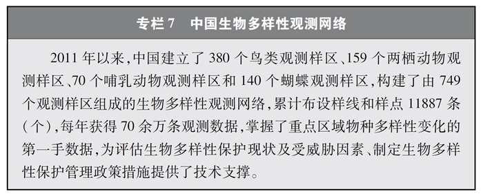 完善監(jiān)測觀測網絡。中國建立起各類生態(tài)系統(tǒng)、物種的監(jiān)測觀測網絡,在生物多樣性理論研究、技術示范與推廣以及物種與生境保護方面發(fā)揮了重要作用,為科研、教育、科普、生產等各領域提供了多樣化的信息服務與決策支持。其中,中國生態(tài)系統(tǒng)研究網絡(CERN)、國家陸地生態(tài)系統(tǒng)定位觀測研究網絡(CTERN)涵蓋所有生態(tài)系統(tǒng)和要素,中國生物多樣性監(jiān)測與研究網絡(Sino BON)覆蓋動物、植物、微生物等多種生物類群,中國生物多樣性觀測網絡(China BON)構建了覆蓋全國的指示物種類群觀測樣區(qū)。