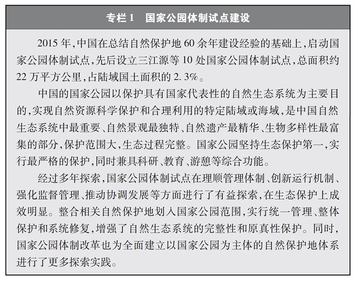 中國不斷推進自然保護地建設,啟動國家公園體制試點,構建以國家公園為主體的自然保護地體系,率先在國際上提出和實施生態(tài)保護紅線制度,明確了生物多樣性保護優(yōu)先區(qū)域,保護了重要自然生態(tài)系統(tǒng)和生物資源,在維護重要物種棲息地方面發(fā)揮了積極作用。