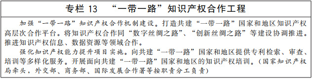 加強(qiáng)知識(shí)產(chǎn)權(quán)國(guó)際合作機(jī)制建設(shè)。鞏固和完善“一帶一路”知識(shí)產(chǎn)權(quán)合作,充分利用“一帶一路”知識(shí)產(chǎn)權(quán)合作平臺(tái),擴(kuò)大合作項(xiàng)目規(guī)模和儲(chǔ)備。深度參與金磚國(guó)家、中美歐日韓、中日韓、中國(guó)—東盟等小多邊知識(shí)產(chǎn)權(quán)合作,加強(qiáng)與各方政策和業(yè)務(wù)規(guī)則交流,支持產(chǎn)業(yè)界積極參與相關(guān)合作機(jī)制。完善跨境司法協(xié)作安排,加強(qiáng)防范打擊侵犯知識(shí)產(chǎn)權(quán)犯罪國(guó)際合作。(中央宣傳部、最高人民法院、最高人民檢察院、外交部、公安部、商務(wù)部、海關(guān)總署、國(guó)家知識(shí)產(chǎn)權(quán)局等按職責(zé)分工負(fù)責(zé))