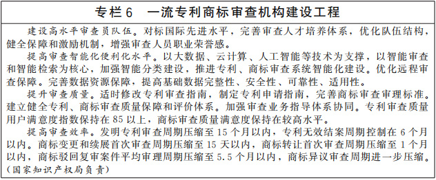 提高知識(shí)產(chǎn)權(quán)審查質(zhì)量和審查效率。完善適應(yīng)創(chuàng)新發(fā)展需求的知識(shí)產(chǎn)權(quán)審查管理體系,優(yōu)化專利、商標(biāo)審查協(xié)作機(jī)制。提升專利商標(biāo)審查機(jī)構(gòu)能力水平,強(qiáng)化專利、商標(biāo)、版權(quán)、地理標(biāo)志、植物新品種全流程審查質(zhì)量管控,提升知識(shí)產(chǎn)權(quán)授權(quán)確權(quán)質(zhì)量。提高專利、商標(biāo)審查業(yè)務(wù)精細(xì)化管理水平,優(yōu)化審查資源配置,加強(qiáng)智能化技術(shù)運(yùn)用,提升審查效能,縮短審查周期。完善專利、商標(biāo)審查模式,加強(qiáng)審查與產(chǎn)業(yè)發(fā)展的政策協(xié)同和業(yè)務(wù)聯(lián)動(dòng),滿足產(chǎn)業(yè)綠色轉(zhuǎn)型和新領(lǐng)域新業(yè)態(tài)創(chuàng)新發(fā)展等社會(huì)多樣化需求。(中央宣傳部、工業(yè)和信息化部、農(nóng)業(yè)農(nóng)村部、國(guó)家林草局、國(guó)家知識(shí)產(chǎn)權(quán)局等按職責(zé)分工負(fù)責(zé))