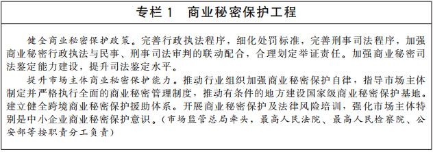 健全知識(shí)產(chǎn)權(quán)法律法規(guī)。開展知識(shí)產(chǎn)權(quán)基礎(chǔ)性法律研究。統(tǒng)籌推進(jìn)專利法、商標(biāo)法、著作權(quán)法、反壟斷法、科學(xué)技術(shù)進(jìn)步法、電子商務(wù)法等相關(guān)法律法規(guī)的修改完善。加強(qiáng)地理標(biāo)志、商業(yè)秘密等領(lǐng)域立法,出臺(tái)商業(yè)秘密保護(hù)規(guī)定。完善集成電路布圖設(shè)計(jì)法規(guī)。推進(jìn)修訂植物新品種保護(hù)條例。制定中醫(yī)藥傳統(tǒng)知識(shí)保護(hù)條例。完善與國(guó)防建設(shè)相銜接的知識(shí)產(chǎn)權(quán)法律制度。全面建立并實(shí)施知識(shí)產(chǎn)權(quán)侵權(quán)懲罰性賠償制度,加大損害賠償力度。研究建立健全符合知識(shí)產(chǎn)權(quán)審判規(guī)律的特別程序法律制度。適應(yīng)科技進(jìn)步和經(jīng)濟(jì)社會(huì)發(fā)展需要,依法及時(shí)推動(dòng)知識(shí)產(chǎn)權(quán)法律法規(guī)立改廢釋。(中央宣傳部、最高人民法院、最高人民檢察院、科技部、工業(yè)和信息化部、司法部、農(nóng)業(yè)農(nóng)村部、商務(wù)部、國(guó)家衛(wèi)生健康委、市場(chǎng)監(jiān)管總局、國(guó)家國(guó)防科工局、國(guó)家林草局、國(guó)家中醫(yī)藥局、國(guó)家知識(shí)產(chǎn)權(quán)局、中央軍委裝備發(fā)展部等按職責(zé)分工負(fù)責(zé))