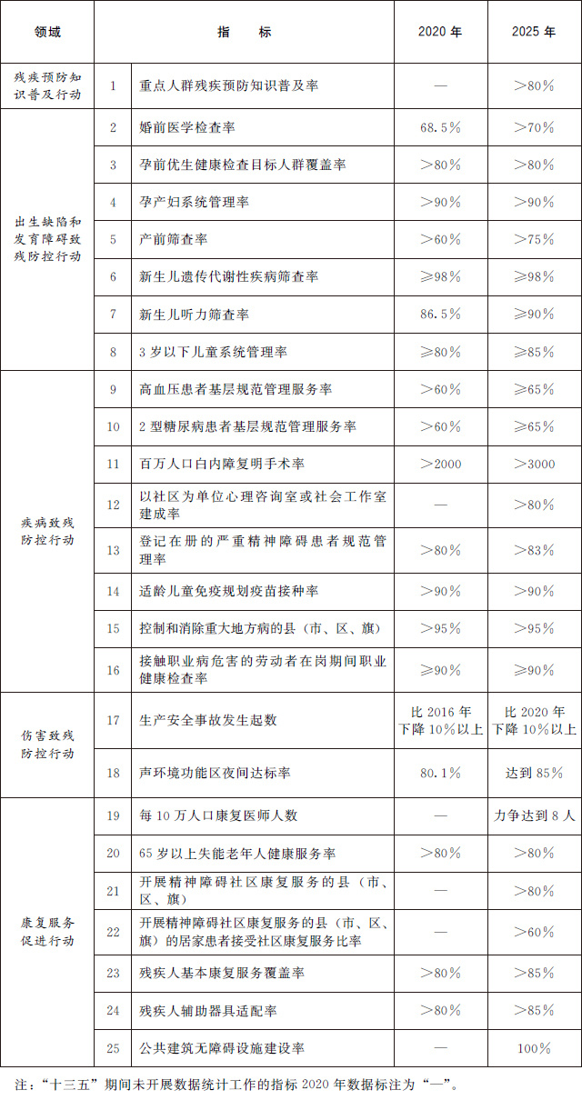 到2025年,覆蓋經(jīng)濟(jì)社會(huì)發(fā)展各領(lǐng)域的殘疾預(yù)防政策體系進(jìn)一步完善,全人群全生命周期殘疾預(yù)防服務(wù)網(wǎng)絡(luò)更加健全,全民殘疾預(yù)防素養(yǎng)明顯提升,遺傳和發(fā)育、疾病、傷害等主要致殘因素得到有效防控,殘疾康復(fù)服務(wù)狀況持續(xù)改善,殘疾預(yù)防主要指標(biāo)處于中高收入國(guó)家前列。