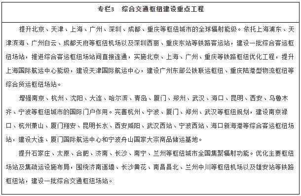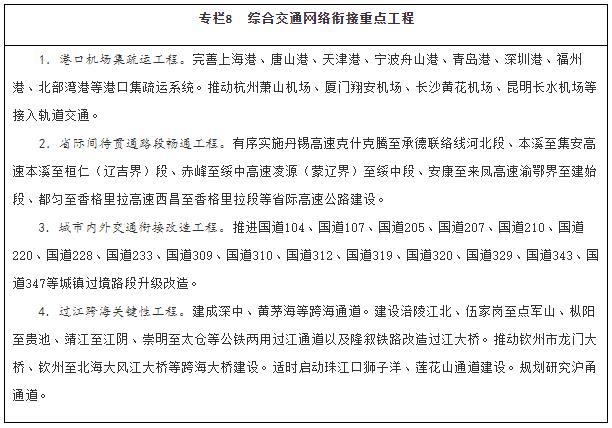 建設(shè)多節(jié)點、網(wǎng)格狀、全覆蓋的京津冀一體化綜合交通網(wǎng)絡(luò),基本建成軌道上的京津冀,高標準、高質(zhì)量打造雄安新區(qū)對外交通網(wǎng)絡(luò),加強北京城市副中心與中心城區(qū)、廊坊北三縣交通基礎(chǔ)設(shè)施互聯(lián)互通,強化北京冬奧會、冬殘奧會交通保障。依托長江黃金水道,整體設(shè)計推進長江經(jīng)濟帶綜合交通運輸體系建設(shè),補強沿江高鐵和鐵路貨運能力,全力打通公路省際待貫通路段,提升江海聯(lián)運、鐵水聯(lián)運發(fā)展水平。推進粵港澳大灣區(qū)基礎(chǔ)設(shè)施互聯(lián)互通,優(yōu)化航運和航空資源配置,加強港澳與內(nèi)地的交通聯(lián)系,支持香港提升國際航運、國際航空樞紐地位。推動長三角地區(qū)交通運輸更高質(zhì)量一體化發(fā)展,加快對外交通、城際交通、都市圈交通高效銜接和有機融合,協(xié)同推進港航、海事一體化發(fā)展,推動上海市、江蘇省、浙江省、安徽省共建輻射全球的航運樞紐,加快提升江蘇通州灣江海聯(lián)動示范區(qū)功能,打造長江集裝箱運輸新出??凇?gòu)建海南島內(nèi)暢通、陸島連通、全球通達的現(xiàn)代綜合交通運輸體系,建設(shè)現(xiàn)代化綜合交通樞紐,穩(wěn)步推進自由貿(mào)易港建設(shè)。構(gòu)建黃河流域綠色安全便捷綜合交通網(wǎng)絡(luò),強化跨區(qū)域大通道建設(shè)。