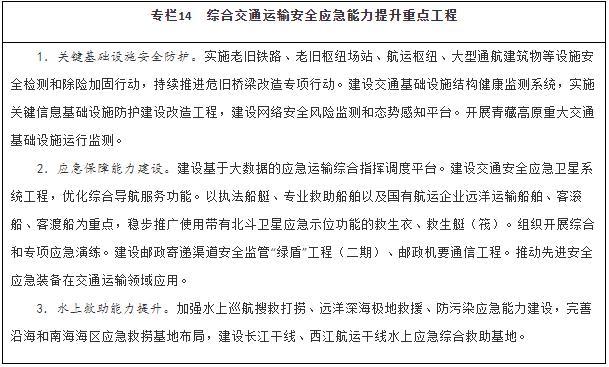 健全綜合交通運輸應(yīng)急管理體制機制,完善應(yīng)急協(xié)調(diào)機制和應(yīng)急預(yù)案體系,加強交通運輸調(diào)度與應(yīng)急指揮平臺建設(shè)。推進區(qū)域性公路應(yīng)急裝備物資儲備中心建設(shè)。加強水上交通安全監(jiān)管、航海保障和救助打撈能力建設(shè),完善沿海和內(nèi)河溢油應(yīng)急設(shè)備庫,構(gòu)建陸??仗煲惑w化水上交通運輸安全保障體系。建設(shè)城市軌道交通應(yīng)急演練中心。以骨干航空物流企業(yè)為主體構(gòu)建航空應(yīng)急服務(wù)網(wǎng)絡(luò)。建設(shè)海事監(jiān)管指揮系統(tǒng)。在開展城市交通基礎(chǔ)設(shè)施地下空間、低洼區(qū)域、重點區(qū)段、重要點位、關(guān)鍵設(shè)施等隱患排查基礎(chǔ)上,建立健全風險臺賬和災(zāi)害隱患清單,補齊設(shè)施設(shè)備、應(yīng)急搶險物資等短板,持續(xù)完善應(yīng)急處置預(yù)案,健全應(yīng)急響應(yīng)機制,提升應(yīng)對極端天氣能力。加強應(yīng)急專業(yè)隊伍和志愿者隊伍建設(shè),充實國家應(yīng)急運輸儲備力量。健全應(yīng)對重大疫情、防范應(yīng)對恐怖襲擊、保障信息安全等非傳統(tǒng)安全應(yīng)急指揮體系和應(yīng)急交通組織。