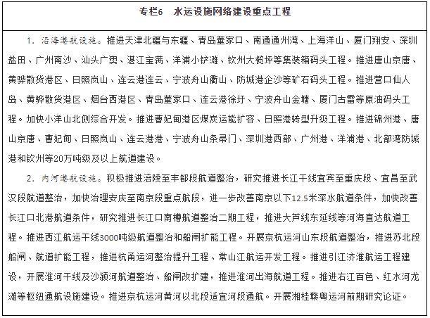 優(yōu)化暢通水運設(shè)施網(wǎng)絡(luò)。建設(shè)京津冀、長三角、粵港澳大灣區(qū)世界級港口群,支持山東打造世界一流的海洋港口,推進東北地區(qū)沿海港口一體化發(fā)展,優(yōu)化港口功能布局,推動資源整合和共享共用。有序推進沿海港口專業(yè)化碼頭及進出港航道等公共設(shè)施建設(shè)。適度超前建設(shè)糧食、能源、礦產(chǎn)資源的接卸、儲存、中轉(zhuǎn)設(shè)施,推進沿海沿江液化天然氣碼頭規(guī)劃建設(shè)。提升內(nèi)河港口專業(yè)化、規(guī)?;?,合理集中布局集裝箱、煤炭、鐵礦石、商品汽車等專業(yè)化碼頭。加強內(nèi)河高等級航道擴能升級與暢通攻堅建設(shè),完善長江、珠江、京杭運河和淮河等水系內(nèi)河高等級航道網(wǎng)絡(luò),進一步提升珠三角高等級航道網(wǎng)出海能力,全面加強長三角、珠江—西江高等級航道網(wǎng)未達標段建設(shè)。推動重要支流航道和庫湖區(qū)航道、內(nèi)河旅游航道、便民碼頭建設(shè)。