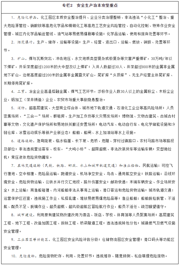 深化專(zhuān)項(xiàng)整治。深入推進(jìn)危險(xiǎn)化學(xué)品、礦山、消防、交通運(yùn)輸、建筑施工、民爆、特種設(shè)備、大型商業(yè)綜合體等重點(diǎn)行業(yè)領(lǐng)域安全整治,解決影響制約安全生產(chǎn)的薄弱環(huán)節(jié)和突出問(wèn)題,督促企業(yè)嚴(yán)格安全管理、加大安全投入、落實(shí)風(fēng)險(xiǎn)管控措施。結(jié)合深化供給側(cè)結(jié)構(gòu)性改革,推動(dòng)安全基礎(chǔ)薄弱、安全保障能力低下且整改后仍不達(dá)標(biāo)的企業(yè)退出市場(chǎng)。統(tǒng)籌考慮危險(xiǎn)化學(xué)品企業(yè)搬遷和項(xiàng)目建設(shè)審批,優(yōu)先保障符合條件企業(yè)的搬遷用地。持續(xù)推進(jìn)企業(yè)安全生產(chǎn)標(biāo)準(zhǔn)化建設(shè),實(shí)現(xiàn)安全管理、操作行為、設(shè)施設(shè)備和作業(yè)環(huán)境規(guī)范化。推動(dòng)淘汰落后技術(shù)、工藝、材料和設(shè)備,加大重點(diǎn)設(shè)施設(shè)備、儀器儀表檢驗(yàn)檢測(cè)力度。推動(dòng)各類(lèi)金融機(jī)構(gòu)出臺(tái)優(yōu)惠貸款等金融類(lèi)產(chǎn)品,大力推廣新技術(shù)、新工藝、新材料和新裝備,實(shí)施智能化礦山、智能化工廠、數(shù)字化車(chē)間改造,開(kāi)展智能化作業(yè)和危險(xiǎn)崗位機(jī)器人替代示范。強(qiáng)化危險(xiǎn)廢物全過(guò)程監(jiān)管,動(dòng)態(tài)修訂《國(guó)家危險(xiǎn)廢物名錄》,修訂危險(xiǎn)廢物鑒別、貯存以及水泥窯協(xié)同處置污染控制等標(biāo)準(zhǔn),制定完善危險(xiǎn)廢物重點(diǎn)監(jiān)管單位清單。建立廢棄危險(xiǎn)化學(xué)品等危險(xiǎn)廢物監(jiān)管協(xié)作和聯(lián)合執(zhí)法工作機(jī)制,加強(qiáng)危險(xiǎn)廢物監(jiān)管能力與應(yīng)急處置技術(shù)支持能力建設(shè)。