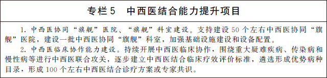 推動(dòng)綜合醫(yī)院中西醫(yī)協(xié)同發(fā)展。在綜合醫(yī)院推廣“有機(jī)制、有團(tuán)隊(duì)、有措施、有成效”的中西醫(yī)結(jié)合醫(yī)療模式,將中醫(yī)納入多學(xué)科會(huì)診體系,加強(qiáng)中西醫(yī)協(xié)作和協(xié)同攻關(guān),制定實(shí)施“宜中則中、宜西則西”的中西醫(yī)結(jié)合診療方案。將中西醫(yī)協(xié)同發(fā)展工作納入醫(yī)院評(píng)審和公立醫(yī)院績(jī)效考核。推動(dòng)三級(jí)綜合醫(yī)院全部設(shè)置中醫(yī)臨床科室,設(shè)立中醫(yī)門診和中醫(yī)病床。打造一批中西醫(yī)協(xié)同“旗艦”醫(yī)院、“旗艦”科室,開展重大疑難疾病、傳染病、慢性病等中西醫(yī)聯(lián)合攻關(guān)。