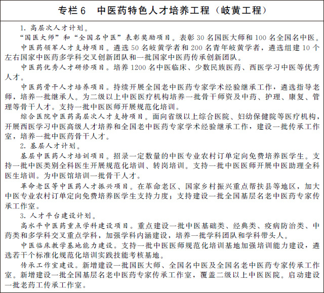 2.強(qiáng)化中醫(yī)藥特色人才隊(duì)伍建設(shè)。實(shí)施中醫(yī)藥特色人才培養(yǎng)工程(岐黃工程)。打造岐黃學(xué)者品牌,持續(xù)開展岐黃學(xué)者培養(yǎng)、全國(guó)中醫(yī)臨床優(yōu)秀人才研修等項(xiàng)目,做強(qiáng)領(lǐng)軍人才、優(yōu)秀人才、骨干人才梯次銜接的高層次人才隊(duì)伍。建設(shè)一批高水平中醫(yī)藥重點(diǎn)學(xué)科。構(gòu)建符合中醫(yī)藥特點(diǎn)的人才培養(yǎng)模式,發(fā)展中醫(yī)藥師承教育,建立高年資中醫(yī)醫(yī)師帶徒制度,與職稱評(píng)審、評(píng)優(yōu)評(píng)先等掛鉤,持續(xù)推進(jìn)全國(guó)名老中醫(yī)藥專家傳承工作室、全國(guó)基層名老中醫(yī)藥專家傳承工作室建設(shè)。將綜合醫(yī)院、婦幼保健院等醫(yī)療機(jī)構(gòu)中醫(yī)藥人才納入各類中醫(yī)藥人才培養(yǎng)項(xiàng)目。按照“下得去、留得住、用得上”的要求,加強(qiáng)基層中醫(yī)藥人才隊(duì)伍建設(shè),根據(jù)需求合理確定中醫(yī)專業(yè)農(nóng)村訂單定向免費(fèi)培養(yǎng)醫(yī)學(xué)生規(guī)模,在全科醫(yī)生特崗計(jì)劃中積極招收中醫(yī)醫(yī)師。推廣中醫(yī)藥人員“縣管鄉(xiāng)用”,探索推進(jìn)輪崗制與職稱評(píng)審相銜接。適當(dāng)放寬長(zhǎng)期服務(wù)基層的中醫(yī)醫(yī)師職稱晉升條件,表彰獎(jiǎng)勵(lì)評(píng)優(yōu)向基層一線和艱苦地區(qū)傾斜,引導(dǎo)中醫(yī)藥人才向基層流動(dòng)。