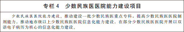 3.發(fā)展少數(shù)民族醫(yī)藥。加強(qiáng)少數(shù)民族醫(yī)醫(yī)療機(jī)構(gòu)建設(shè),提高民族地區(qū)基層醫(yī)療衛(wèi)生機(jī)構(gòu)少數(shù)民族醫(yī)藥服務(wù)能力。改善少數(shù)民族醫(yī)醫(yī)院基礎(chǔ)設(shè)施條件,加強(qiáng)少數(shù)民族醫(yī)醫(yī)院??颇芰?、制劑能力和信息化能力建設(shè)。建立符合少數(shù)民族醫(yī)醫(yī)療機(jī)構(gòu)自身特點(diǎn)和發(fā)展規(guī)律的績(jī)效評(píng)價(jià)指標(biāo)體系。加大少數(shù)民族醫(yī)藥防治重大疾病和優(yōu)勢(shì)病種研究力度,有效傳承特色診療技術(shù)和方法。鼓勵(lì)和扶持少數(shù)民族醫(yī)藥院校教育、師承教育和繼續(xù)教育。加大對(duì)少數(shù)民族醫(yī)藥的傳承保護(hù)力度,持續(xù)開展少數(shù)民族醫(yī)藥文獻(xiàn)搶救整理工作,推動(dòng)理論創(chuàng)新和技術(shù)創(chuàng)新。